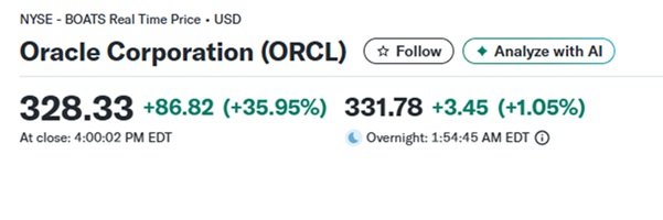 બજારમાં શક્તિશાળી પ્રદર્શન સાથે, ઓરેકલ કોર્પોરેશન (ORCL) એ એક જ ટ્રેડિંગ સેશનમાં 34% નો અદભૂત ઉછાળો નોંધાવ્યો, જેનું કારણ તેના ક્લાઉડ કમ્પ્યુટિંગ વિભાગમાં જબરદસ્ત વૃદ્ધિ અને ધમાકેદાર કમાણી હતી. આ ઉછાળાએ એક જ દિવસે ઓરેકલના માર્કેટ કેપિટલાઇઝેશનમાં લગભગ $100 બિલિયન ઉમેર્યું—જે વિશ્વની ઘણી કંપનીઓના કુલ માર્કેટ મૂલ્ય કરતાં વધારે છે.